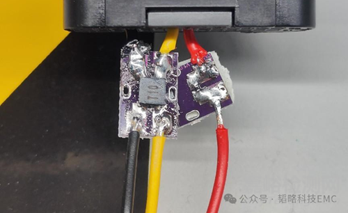 正常來(lái)說(shuō)磁環(huán)圍繞線繞一圈效果會(huì)更好,考慮到電流法測(cè)試有線束長(zhǎng)度要求,繞一圈線束會(huì)增加一定的線長(zhǎng),可能導(dǎo)致測(cè)試結(jié)果偏差,所以直接扣上去看效果,目前看來(lái),超標(biāo)的頻段噪聲屬于共模噪聲。