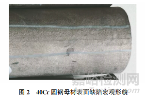 對其母材進行取樣,并對試樣進行熱酸浸,發(fā)現(xiàn)母材表面也存在裂紋缺陷,該缺陷與圓鋼的軸向平行,貫穿整個試樣表面,40Cr圓鋼母材表面缺陷宏觀形貌如圖2所示。