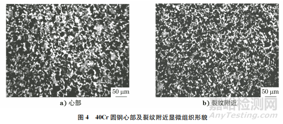 在含裂紋的圓鋼上截取并制備規(guī)格為10mm×60mm×10mm的金相試樣,再用體積分數(shù)為4%的硝酸乙醇溶液對試樣進行腐蝕,分別觀察圓鋼心部及裂紋附近的顯微組織形貌,結果如圖4所示。由圖4可知:40Cr圓鋼心部和裂紋處的顯微組織均為網(wǎng)狀鐵素體+珠光體,圓鋼心部和邊部的晶粒度沒有明顯差異;裂紋附近沒有脫碳現(xiàn)象,裂紋末端圓頓處沒有明顯分叉形貌。