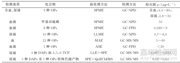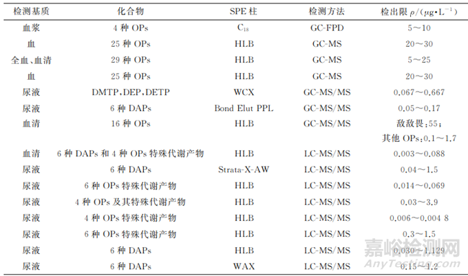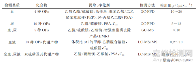 1)針對生物樣本中OPs的分析,如果目的是追溯人體暴露于具體哪種 OPs(如中毒事件原因排查),則應選擇血液樣本;如果目的是監(jiān)測正常人群日常生活中暴露于OPs的總負荷,則尿液樣本更具優(yōu)勢。