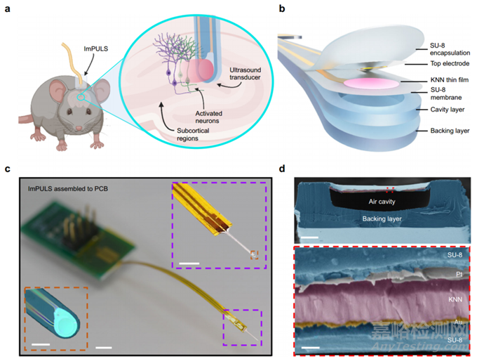 植入式壓電超聲刺激器(ImPULS)是一種柔性壓電微機(jī)械超聲換能器(pMUT),采用轉(zhuǎn)印工藝?yán)媚陀镁酆衔锝^緣的生物相容性壓電陶瓷制造,其中,SU-8作為基板、封裝層和背襯層,KNN作為壓電層,鉻/金和鉑分別用作頂部和底部電極,以及鉻/金作為金屬互連線。選擇KNN作為無(wú)鉛壓電層的原因在于其較高的壓電系數(shù)和耐用性,以及生物相容性、無(wú)毒性和商業(yè)可用性。最終的裝置采用柔性ACF電纜和PCB板組裝而成。