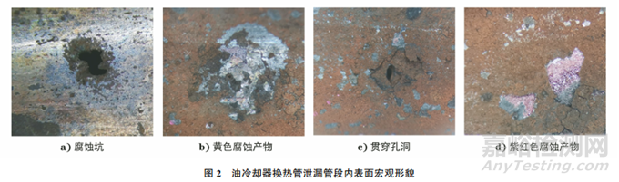 沿換熱管管段軸線切開,采用體視顯微鏡對油冷卻器換熱管泄漏管段的內(nèi)表面宏觀形貌進行觀察,結(jié)果如圖2所示。由圖2可知:管段內(nèi)表面附著有疏松的泥土色垢層,垢層中間不規(guī)則地間斷分布有紫紅色、黃色的產(chǎn)物;在管段內(nèi)表面可以看到已經(jīng)貫穿的細小孔洞和沒有貫穿的腐蝕坑,腐蝕穿孔附近存在明顯的片層狀脫落或蓬松凸起的現(xiàn)象。