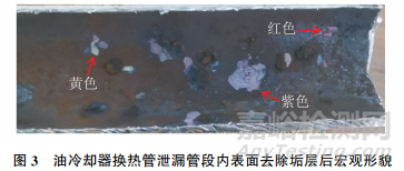 將切開的管段放入盛有無水乙醇的燒杯中,用超聲清洗管段,超聲清洗后銅管內(nèi)壁的垢層脫落,其表面呈現(xiàn)黃色、紫色及紅色(見圖3)。