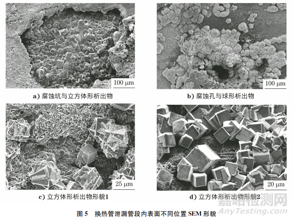 使用掃描電鏡觀察換熱管泄漏管段銅管內(nèi)、外表面不同區(qū)域的微觀形貌,并用附帶的能譜儀對其進行微區(qū)成分分析,結(jié)果如圖5,6所示。由圖5,6可知:銅管內(nèi)表面存在腐蝕坑與腐蝕孔,腐蝕坑中分布有規(guī)則立方體形狀的析出物,腐蝕孔附近分布有球形析出物;銅管外表面局部主要為疏松的細小針狀腐蝕產(chǎn)物。
