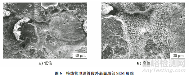 CuCl和CuS的形成將加快銅的溶解,且點腐蝕位置的電位較未發(fā)生腐蝕部位的電位變得更低,形成了大陰極小陽極的腐蝕電池,加速了腐蝕部位的腐蝕進程,形成惡性循環(huán)。此外,腐蝕產(chǎn)物與基體結(jié)合能力較弱,當腐蝕產(chǎn)物逐漸增多時,垢層變得疏松,管內(nèi)介質(zhì)沖刷將表層的腐蝕產(chǎn)物與垢層沖走,這將使換熱管內(nèi)壁露出新鮮的金屬表面,隨著腐蝕的持續(xù)進行,該處腐蝕坑越來越大,越來越深。最后,有垢層沉積的部位發(fā)生腐蝕穿孔,出現(xiàn)管路泄漏的現(xiàn)象。