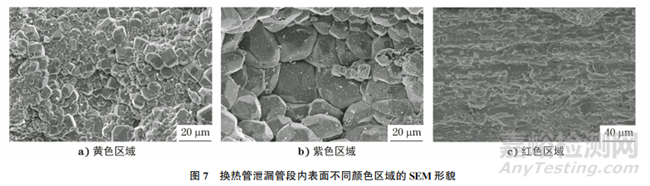 換熱管泄漏管段銅管內(nèi)表面的垢層脫落后,表面呈現(xiàn)黃色、紫色與紅色,對不同顏色的微區(qū)進行掃描電鏡分析,結(jié)果如圖7所示。由圖7可知:銅管內(nèi)表面黃色區(qū)域為細小立方體形析出物,紫色區(qū)域為尺寸較大的立方體形析出物,紅色區(qū)域呈均勻腐蝕形貌,銅管內(nèi)表面不同區(qū)域微觀形貌存在差異,造成其內(nèi)表面宏觀下呈現(xiàn)不同的顏色。