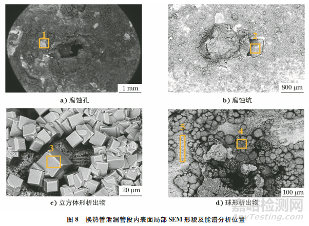 換熱管泄漏管段內(nèi)表面局部SEM形貌及能譜分析位置如圖8所示,換熱管泄漏管段外表面SEM形貌及能譜分析位置如圖9所示,表2為能譜分析結(jié)果。由表2可知:銅管內(nèi)表面化學(xué)成分主要含有Cu、Ni、Fe等元素,腐蝕坑和腐蝕孔局部表面還存在Cl、S、O、Si等元素,不同位置各個元素的質(zhì)量分數(shù)也存在一定差異,某些位置S元素質(zhì)量分數(shù)達到1.9%,Cl元素質(zhì)量分數(shù)達到 0.9%。在液體環(huán)境中,氯離子和硫離子會加速銅管的腐蝕。此外,立方體形析出物和球形析出物的成分差異主要體現(xiàn)在O元素,說明液體環(huán)境中O元素含量對析出物的形狀存在一定影響;銅管外表面疏松的細小針狀腐蝕 產(chǎn)物為鐵的氧化物。