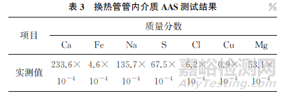 油冷卻器換熱管內(nèi)介質(zhì)為油冷卻器的熱交換介質(zhì),對換熱管的腐蝕有著重要影響。為驗證管內(nèi)介質(zhì)對換熱管腐蝕泄漏的影響,采用原子吸收光譜儀對換熱管內(nèi)的循環(huán)冷卻水進行成分測定,結(jié)果如表3所示。由表3可知:管內(nèi)循環(huán)冷卻水中的Ca、Na、Mg等元素含量較高,這些元素容易使材料結(jié)垢。管內(nèi)循環(huán)冷卻水中的S元素和Cl元素含量過高,這些元素容易造成換熱管內(nèi)壁的腐蝕。