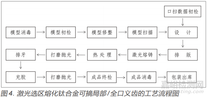 激光選區(qū)熔化鈷鉻烤瓷冠/橋工藝流程見圖2;激光選區(qū)熔化鈷鉻嵌體/樁核工藝流程見圖3;激光選區(qū)熔化鈦合金可摘局部/全口義齒工藝流程見圖4。
