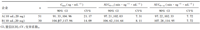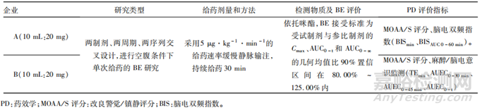 查閱藥物臨床試驗登記與信息公示平臺及藥審中心近年來申報本品仿制藥的 BE 研究開展情況,整體來講,均采用兩制劑、兩周期、兩序列交叉設計,進行空腹條件下單次給藥的BE研究。研究中納入健康男性和女性受試者,給藥劑量為圖片的給藥速率緩慢靜脈輸注,持續(xù)給藥30min。研究方案規(guī)定檢測物質為原形藥物依托咪酯,以依托咪酯的主要 PK 參數圖片。作為 BE 評價的指標,接受標準為依托咪酯的主要 PK參數幾何均值比值的 90%置信區(qū)間在80.00%~125.00%內。在藥物輸注過程中,所有受試者均接受了嚴密的安全性監(jiān)測,由麻醉醫(yī)師在現場進行監(jiān)護和必要的干預。不同的是 BE 研究中 PD 指標的選擇,如采用 BIS 及MOAA/S 評分等。目前,已獲批兩家申請人開展 BE研究的主要設計、PK 參數及 BE 結果情況,見表1、表 2及表3。
