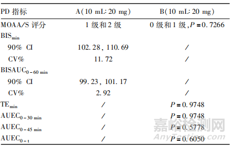依托咪酯中/長鏈脂肪乳注射液的PD評價主要關注其麻醉/鎮(zhèn)靜效果。在現有的研究方法中,評分法或儀器法是2種常用的評價手段。為確保評價的準確性和客觀性,筆者建議研究過程中應監(jiān)測腦電雙頻指數( bispectral index scale,BIS)和/或進行改良警覺/鎮(zhèn)靜(modified observer’s assessment of alertness/sedation,MOAA/S)評分等。BIS 監(jiān)測應詳細記錄并分析從給藥到給藥結束后時間內的 BIS 值-時間曲線下面積(圖片)、給藥過程中 BIS 達到的最低值(圖片)、最小 BIS 值出現時間(圖片)等結果,反映藥物對大腦電活動的影響程度和持續(xù)時間。MOAA/S 評分應對評分值、受試者完全蘇醒時間等進行統(tǒng)計分析,以評估受試者在不同鎮(zhèn)靜水平下的表現。PD評價中應對受試制劑和參比制劑相關評分的差異進行統(tǒng)計分析并對結果進行解釋。