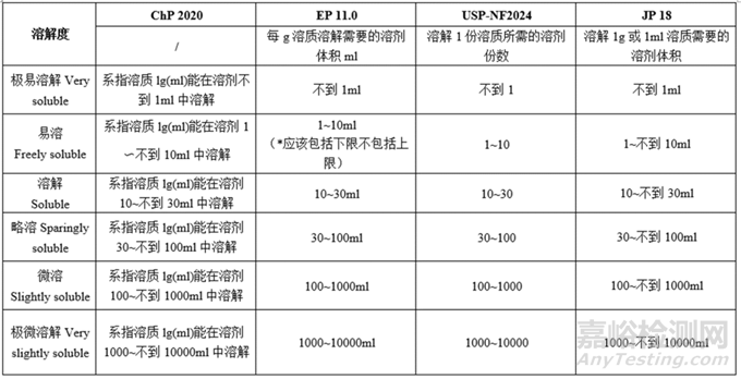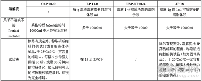 小結(jié):各國藥典對各溶解度的描述所用詞匯均一致;各項溶解度對應(yīng)的需要的溶劑體積基本一致;試驗法,ChP、EP、JP的操作溫度略有不同,USP未說明溶解度的試驗法。