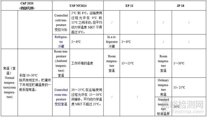 溫度—各國藥典對各種溫度的劃分不同,規(guī)定范圍也不大相同,其中USP對溫度的劃分類別最多、定義描述最為詳細;JP的室溫和常溫不同,分別為1~30℃、15–25℃,中國藥典的室溫和常溫一致,EP、USP僅有室溫。