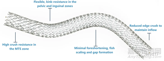 具有獨(dú)特的集成設(shè)計(jì),將所有必要的靜脈支架特性獨(dú)特地結(jié)合到一個(gè)支架中,沿其長度從髂骨區(qū)的高抗壓性變?yōu)楣桥鑵^(qū)的高柔韌性,從而針對髂股靜脈系統(tǒng)的動(dòng)態(tài)負(fù)載條件;