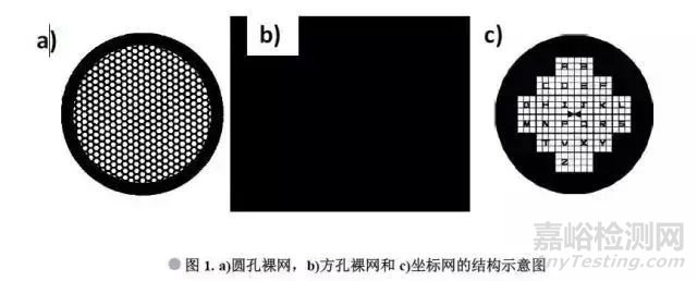 1)按孔的形狀結(jié)構(gòu):如圖1所示,一般分為圓孔裸網(wǎng)、方孔裸網(wǎng)等, 圓孔網(wǎng)為國產(chǎn)網(wǎng),采用腐蝕法制備,方孔網(wǎng)為進(jìn)口網(wǎng),采用電沉積方法制備,相比較圓孔網(wǎng),方孔網(wǎng)的網(wǎng)格更規(guī)整,孔可以做的更小。