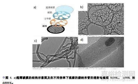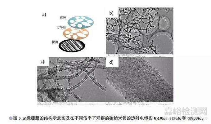3)微柵膜:為了解決碳支持膜在高分辨觀察時的背底問題,可在支持膜上特意制作些微孔,稱為微柵膜,通常微柵膜的孔大小不一,孔徑為幾百納米到幾微米,如圖3所示為微柵膜的結(jié)構(gòu)示意圖,應(yīng)用微柵膜負(fù)載樣品,樣品可搭載在孔的邊緣,在孔內(nèi)的部分可實(shí)現(xiàn)無背底觀察,以提高成像的襯度,由圖3 d)可以看出碳納米管的高分辨像無膜的背底干擾,相比碳支持膜襯度有顯著提高。