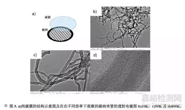 2)碳支持膜:是一種最常用的支持膜,有兩層膜結(jié)構(gòu)。從下至上依次為裸網(wǎng),方華膜和碳膜,結(jié)構(gòu)如圖2 a)所示。由于碳層具有較強(qiáng)的導(dǎo)電性和導(dǎo)熱性,彌補(bǔ)了無碳方華膜的荷電效應(yīng)以及熱效應(yīng),增強(qiáng)了膜整體的穩(wěn)定性,適合大多數(shù)納米材料和生物樣品的一般形貌觀察。我們以多壁碳納米管為標(biāo)樣,用透射電鏡JEM-2100F觀察的10K,50K,800K倍率下的碳納米管,可以看出應(yīng)用碳支持膜負(fù)載碳納米管在透射電鏡下可實(shí)現(xiàn)從低倍至高倍的觀察,但是在高分辨觀察時,碳顆粒本身的襯度對于碳納米管的高分辨結(jié)構(gòu)有較大的影響。