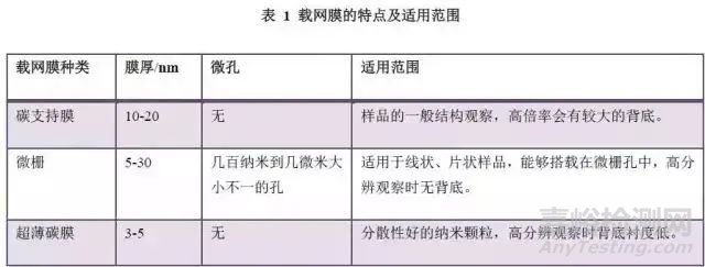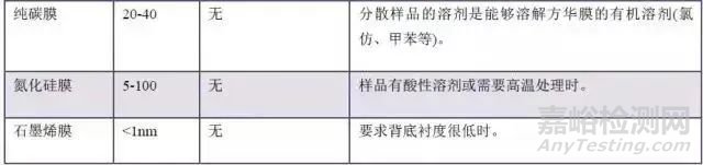 由上述介紹的載網(wǎng)膜的結(jié)構(gòu)及特點(diǎn),可根據(jù)樣品的特征選擇合適的載網(wǎng)膜,匯總?cè)绫?所示,需要說明的是一些特殊情況: