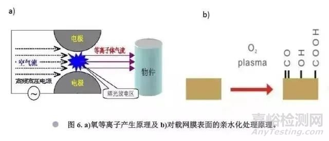 直接制備的各種裸網(wǎng)及載網(wǎng)膜通常表面是疏水的,不利于親水性樣品的吸附,而透射電鏡觀察時,很多樣品是親水的,因此需要對裸網(wǎng)及載網(wǎng)膜進(jìn)行親水性處理,通常用含氧的等離子體進(jìn)行處理,可用射頻輝光放電的方法產(chǎn)生氧等離子,其原理如圖6所示,空氣在高頻高壓的電場中產(chǎn)生放電,氧氣被電離成氧等離子體,氧等離子體與載網(wǎng)膜表面反應(yīng)生成一系列親水性基團(tuán),從而使表面呈親水性。