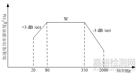 高加速應(yīng)力篩選中施加的振動應(yīng)力為隨機振動,主要參數(shù)為加速度功率譜密度、頻率范圍、振動軸向、振動時間等。典型的隨機振動普如下圖1所示。