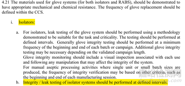 EU GMP附錄1中,明確要求對(duì)隔離器的泄露測(cè)試要定義的周期內(nèi)執(zhí)行,但未提及具體的執(zhí)行標(biāo)準(zhǔn)和方法。(PIC/S發(fā)布的PE 009-17:2023版中的描述和歐盟附錄1中的描述一致,不再贅述)