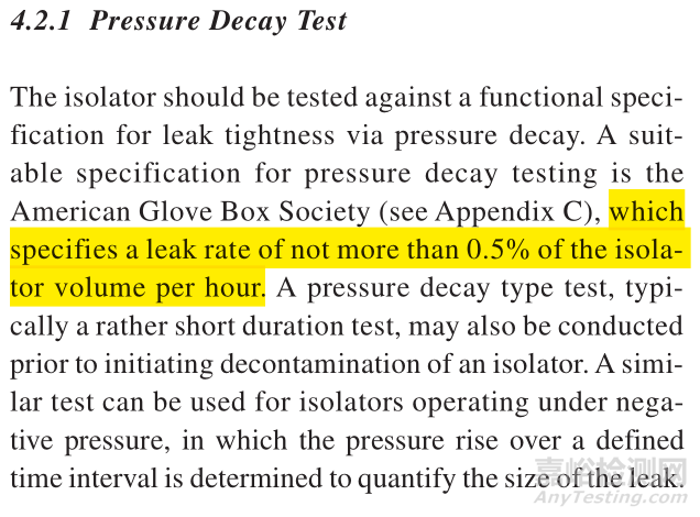 PDA TR34:2011中提及:根據(jù)美國(guó)手套箱協(xié)會(huì)提供的數(shù)據(jù),隔離器的泄露率通過(guò)壓降測(cè)試的結(jié)果為不能超過(guò)腔體容積的0.5%每小時(shí).
