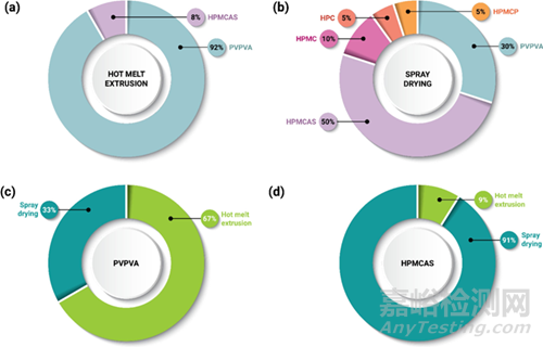 圖3.(a)熱熔擠出中ASD聚合物選擇頻率。(b)噴霧干燥中ASD聚合物選擇頻率。(c)用PVPVA配制的ASDs的制造工藝選擇頻率。(d)用HPMCAS配制的ASDs的制造工藝選擇頻率。2