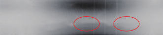 同時從圖像中可以看出有兩條過渡線,原因是透照方式為雙壁單影透照,透照方向與雙壁間隙邊界對應位置連線不平行時,在成像板上的投影錯位導致出現(xiàn)兩條過渡線。