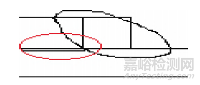 如圖10所示,由于裝配是本身存在的配合間隙,在焊接的過程中熱量的輸人會擴大配合間隙的影響,形成如圖11所示的錯邊未焊透,及融化區(qū)域未包含過渡接頭直角區(qū)域根部。