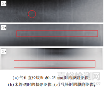 氣孔直徑約為φ0.25mm的情況可清晰檢出,未焊透、氣脹等條形缺陷也可清晰檢出,在圖像中會隔斷魚鱗紋,如圖6所示。