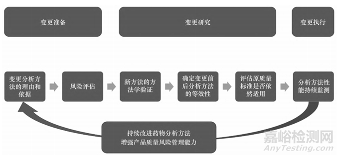 分析方法的開發(fā)、驗證、轉(zhuǎn)移、變更和日常監(jiān)測是連續(xù)且相互關(guān)聯(lián)的,貫穿了產(chǎn)品生命周期管理的始終,不斷推動著產(chǎn)品質(zhì)量朝著更優(yōu)的方向發(fā)展[3-4]。藥物早期的研發(fā)、臨床試驗申請和注冊過程往往經(jīng)歷分析方法的開發(fā)、建立、確認(rèn)、驗證、轉(zhuǎn)移、再驗證等過程,從而確保分析方法適用于藥物的過程中控制、放行檢測和穩(wěn)定性檢測[5]。在獲批上市后,一方面上市許可持有人(marketing authorization holder,MAH)需要對生產(chǎn)工藝進(jìn)行持續(xù)驗證,不斷積累商業(yè)化生產(chǎn)的研究數(shù)據(jù);另一方面,隨著更加先進(jìn)和靈敏的分析技術(shù)的出現(xiàn)和成熟運用,MAH 利用這些新技術(shù)持續(xù)改進(jìn)藥物分析方法,采用更優(yōu)的分析技術(shù)以增強(qiáng)產(chǎn)品質(zhì)量風(fēng)險管理能力[6]。應(yīng)用新的質(zhì)量控制分析方法,往往具有降低檢驗成本、提高方法穩(wěn)健性、加快產(chǎn)品放行、減少實驗動物使用等方面的優(yōu)勢。