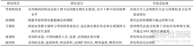 《中華人民共和國藥典》、美國藥典和歐洲藥典均收錄了微生物檢驗替代方法驗證的相關(guān)指導(dǎo)原則,研究者可以根據(jù)微生物檢驗方法的定性或定量差異,開展替代方法的方法學(xué)驗證。微生物檢驗替代方法的驗證可參考《中華人民共和國藥典》2020年版三部“藥品微生物檢驗替代方法驗證指導(dǎo)原則”開展。無菌檢查法的替代驗證屬于定性檢查應(yīng)至少考察快速檢驗分析方法的專屬性、檢測限、重現(xiàn)性和耐用性。微生物限度檢驗的替代驗證屬于定量檢查,應(yīng)考察快速檢驗方法的準(zhǔn)確度、精密度、專屬性、定量限、線性、范圍、重現(xiàn)性、耐用性。研究者還需要開展方法適用性研究,考察制劑是否存在生長抑制或產(chǎn)品干擾。研究者應(yīng)證明替代方法與藥典分析方法之間的等效性。等效性研究是一種比較試驗,要求使用相同范圍的微生物平行運行2 種方法。根據(jù)2種方法所產(chǎn)生數(shù)據(jù)的統(tǒng)計處理來證明替代方法結(jié)果等效或優(yōu)于(不劣于)藥典方法。如果替代方法產(chǎn)生的結(jié)果優(yōu)于或等效藥典方法,則認(rèn)為替代無菌檢查的性能等效??焖贌o菌檢驗替代方法的驗證總結(jié)示例見表2。