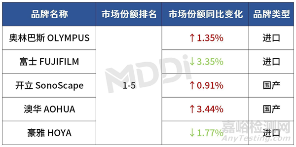 表1 2024年一季度醫(yī)用消化道內(nèi)窺鏡各品牌市場(chǎng)份額變化情況(銷售額Top5)