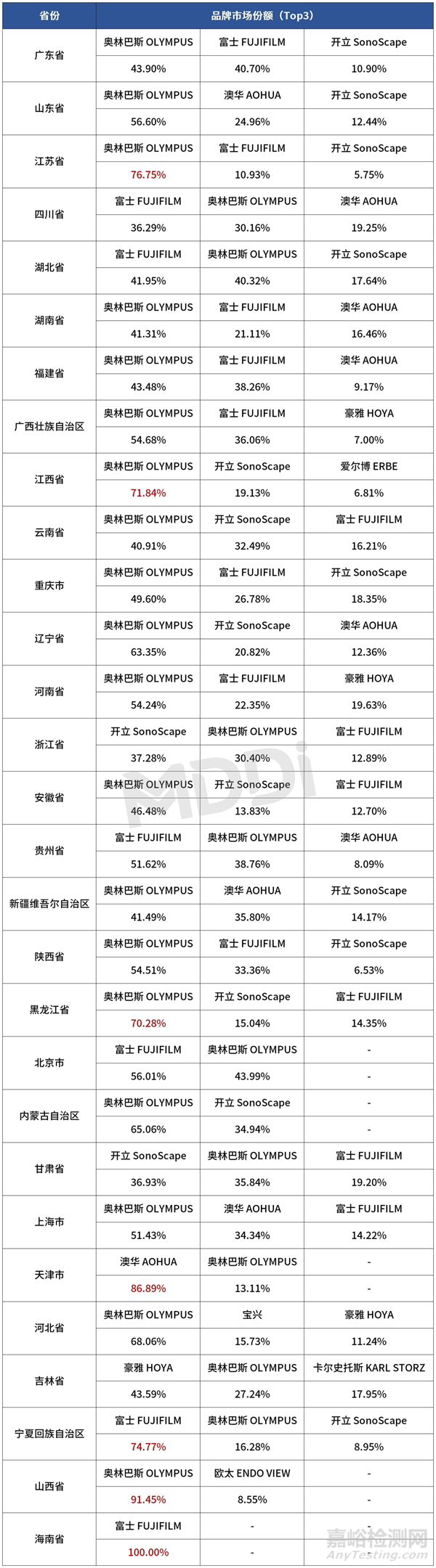 表2 2024年第一季度各地區(qū)消化道內(nèi)窺鏡Top3品牌市場(chǎng)份額情況(銷售額)