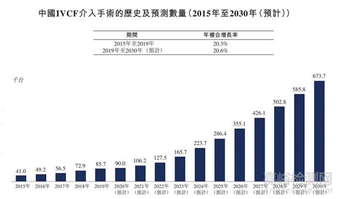 中國(guó)IVCF介入手術(shù)數(shù)量從2015年的4.10萬(wàn)臺(tái)增至2019年的8.57萬(wàn)臺(tái),并預(yù)計(jì)到2030年將進(jìn)一步增至67.37萬(wàn)臺(tái),2019年-2030年的年復(fù)合增長(zhǎng)率為20.6%。下圖表顯示了中國(guó)IVCF介入手術(shù)的歷史比預(yù)測(cè)數(shù)量: