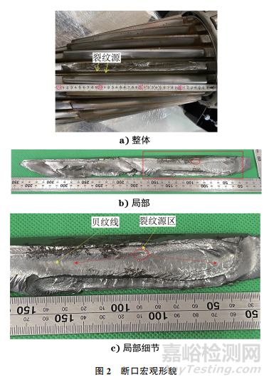 截取中齒軸的斷齒部位,斷口宏觀形貌如圖2所示。由圖2可知:擴(kuò)展區(qū)可見疲勞貝殼紋,收斂方向指向裂紋源區(qū)。裂紋擴(kuò)展方向如圖2中箭頭所示。
