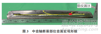 中齒軸斷裂部位齒面宏觀形貌如圖3所示。根據(jù)裂紋源位置以及分叉法原理可以繪制出整個斷齒的裂紋擴(kuò)展方向,如圖3中黃色箭頭所示。中齒軸斷裂性質(zhì)為疲勞斷裂,裂紋起源于齒部位次表面。