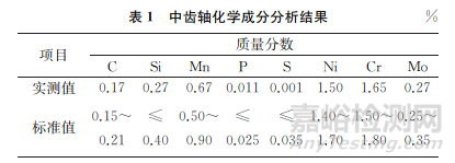 在中齒軸上截取試樣,并對試樣進(jìn)行化學(xué)成分分析,結(jié)果如表1所示。由表1可知:中齒軸的化學(xué)成分符合 EN 10084—2008 《滲碳鋼-交貨技術(shù)條件》對18CrNiMo7-6鋼的要求。