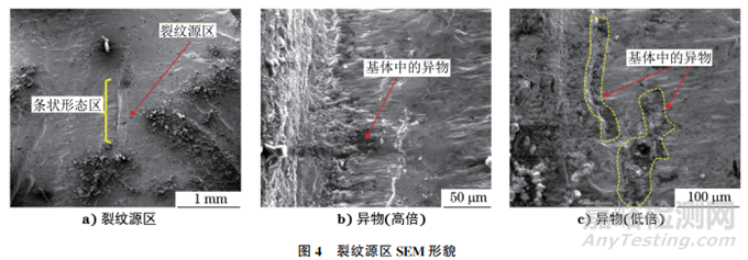 將斷口試樣用超聲波清洗,再將其置于掃描電子顯微鏡下觀察,裂紋源區(qū)SEM形貌如圖4所示。由圖4可知:裂紋源區(qū)呈軸向分布的條狀形態(tài),長度約為1mm;該條狀形態(tài)區(qū)域內(nèi)可見異物。