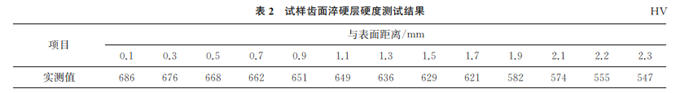 垂直于齒面的剖面截取試樣,將試樣鑲嵌、磨拋后,置于顯微硬度計上進(jìn)行測試,采用9.807N對齒面淬硬層硬度進(jìn)行測定,結(jié)果如表2所示。根據(jù)ISO 6336-5:2016,試樣齒面淬硬層深度為2.26mm。表面硬度及滲碳層深度均符合ISO 6336-5:2016標(biāo)準(zhǔn)要求。