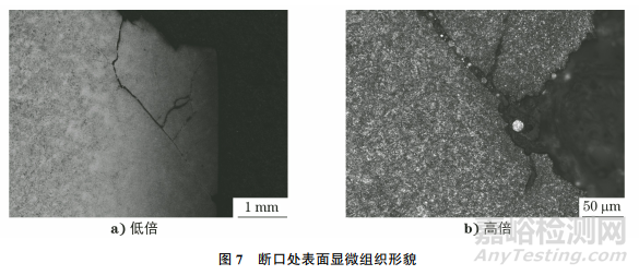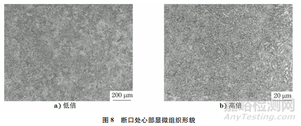 用化學(xué)試劑腐蝕試樣,再將試樣置于光學(xué)顯微鏡下觀察,結(jié)果如圖7,8所示。由圖7,8可知:試樣斷口處表面顯微組織為細(xì)針狀馬氏體+殘余奧氏體+彌散點粒狀分布的碳化物(見圖7);心部顯微組織為低碳馬氏體+貝氏體(見圖8)。