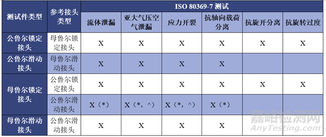 僅在測試的母魯爾鎖定接頭未專門用于與公魯爾鎖定接頭組合使用時,才需要進行帶(*)的測試。此外,分析和說明最壞情況后,可忽略帶(^)的測試。在與負責(zé)ISO 80369-7的ISO技術(shù)委員會代表的討論中,我們確定,在某些情況下,對每項測試進行嚴格檢查可以確定最不理想的配置。