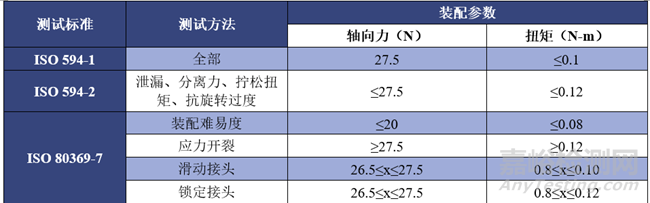 ISO 594的關(guān)鍵要素之一是標(biāo)準(zhǔn)化組裝測試樣本和參考接頭時使用的扭矩和軸向力。ISO 80369-20定義了測試方法,縮小了可接受扭矩和軸向力的范圍,要求每次測試都使用相同的裝配值,并明確了帶有浮動環(huán)或可旋轉(zhuǎn)環(huán)的產(chǎn)品的裝配程序。表2列出了ISO 594和80369的裝配參數(shù)。除了裝配參數(shù)的變化外,許多測試也發(fā)生了很大的變化;標(biāo)題和測試參數(shù)都做了修改,增加了新的測試,裝配難易度測試因較為主觀而被取消。表3比較了各項測試中一些最重要的變化。