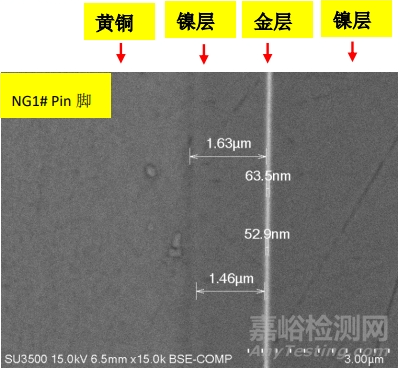 2、SEM測試,發(fā)現(xiàn)NG品鍍金層厚度明顯比OK品?。?/span>