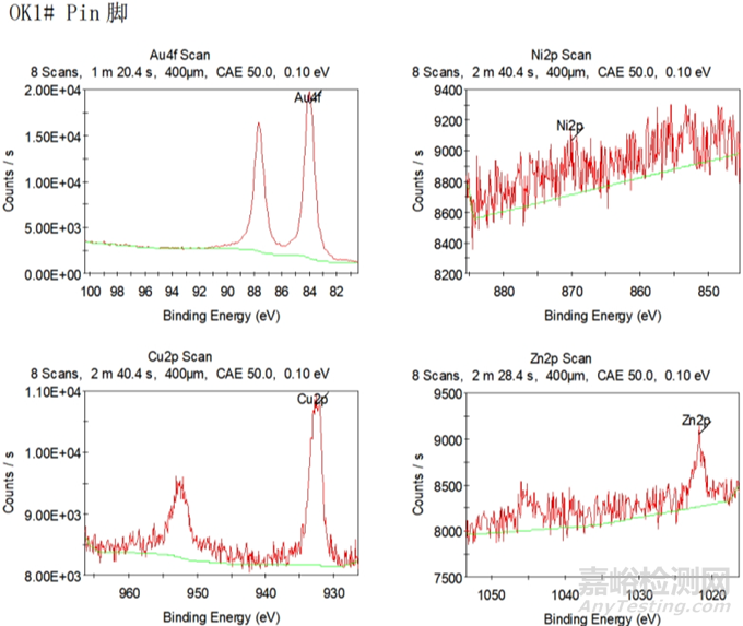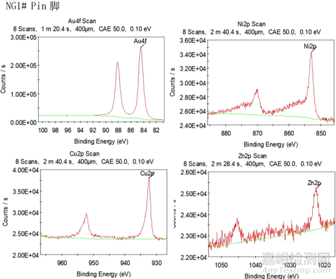 4、Pin腳表面元素分析:XPS分析Ni、Cu、Zn是否遷移到Au層表面。