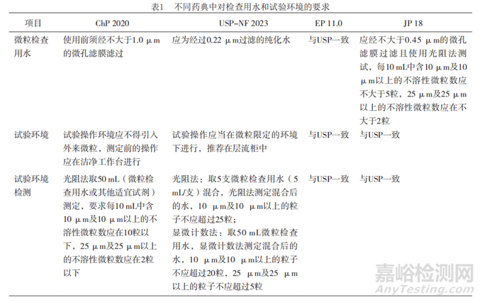 不同藥典推薦的不溶性微粒檢測方法均為光阻法與顯微計數(shù)法,但在檢測涉及的試驗環(huán)境、檢查用溶劑和具體的樣品檢測要求上,中國藥典與美、歐、日藥典存在差異。