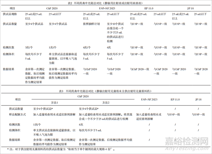 對比歐洲藥典5.0版(EP 5.0)和歐洲藥典10.0版(EP 10.0)及日本藥典15版(JP 15)和日本藥典18版(JP 18),發(fā)現(xiàn)歐洲藥典和日本藥典不溶性微粒檢測方法相關(guān)章節(jié)在近年來無明顯變化。但是EP 11.0<2.9.19>章節(jié)中內(nèi)容相較于EP 10.0增加了生物技術(shù)藥物不溶性微粒檢測相關(guān)內(nèi)容。