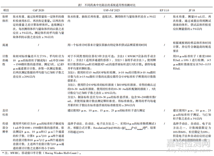 歐洲藥典并未對光阻法的系統(tǒng)適用性進(jìn)行較多描述,中國藥典、美國藥典、日本藥典在系統(tǒng)適用性檢測上的不同之處主要為檢測項目的差異,詳見表7。