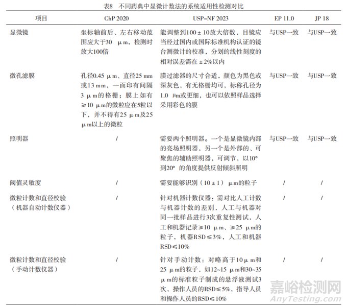 對于顯微計數(shù)法的系統(tǒng)適用性檢測,日、歐藥典內(nèi)容一致,且所涉及的項目在美國藥典均有包含。美國藥典所含內(nèi)容最為詳實,中國藥典在項目要求上相對較少,詳見表8。