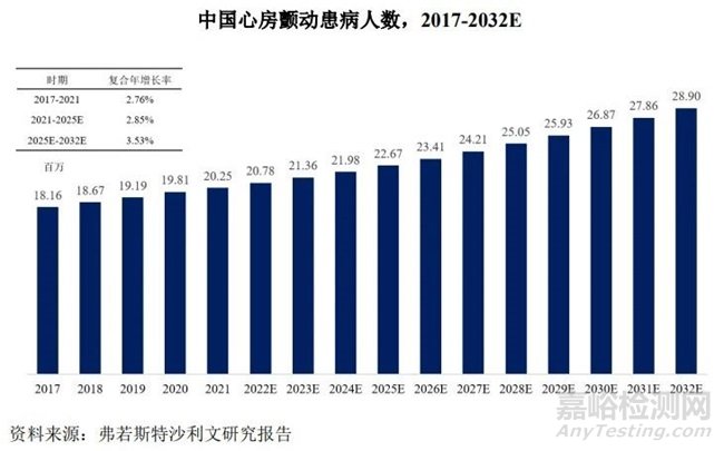 根據(jù)弗若斯特沙利文研究報(bào)告,中國房顫患病人數(shù)從2017年的1,816.38萬人增至2021年的 2,025.47 萬人,期間復(fù)合年增長率為 2.76%。受人口老齡化加劇影響,預(yù)計(jì)到2025 年,房顫患病人數(shù)將達(dá)到2,266.63萬人,2021-2025年的復(fù)合年增長率為 2.85%。2032年中國房顫患病人數(shù)預(yù)計(jì)將進(jìn)一步增至 2,890.25 萬人,2025年至2032年的復(fù)合年增長率為3.53%。